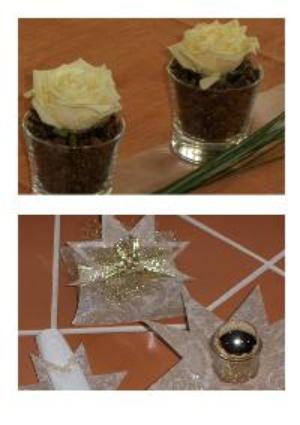 Glas in Glas dekoriert mit einer Creme farbenen Rose und ganzen Kaffeebohnen. Unteres Foto: einlaminierte Serviettensterne mit kleinen Weihnachtskugeln, Geschenkbox und Serviettenring.